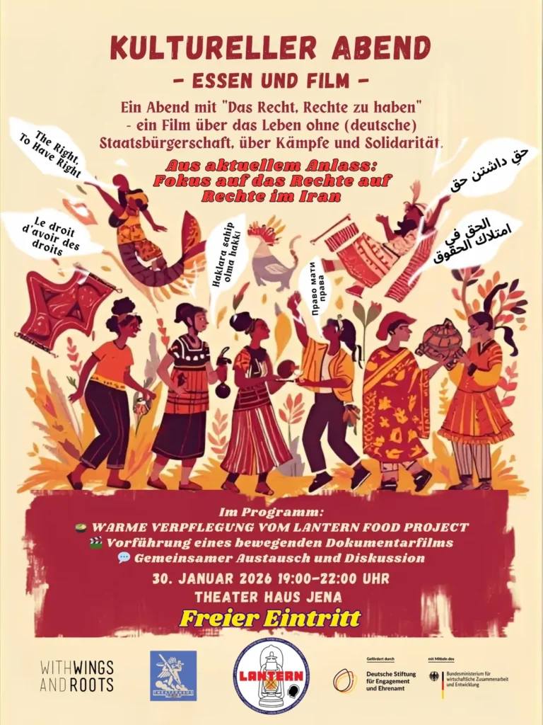 Vor dem Hintergrund der aktuellen Situation im Iran – massiver Menschenrechtsverletzungen, gewaltsamer Repression und der Tötung von Protestierenden – nutzen LANTERN und with Wings and Roots e.V. diese kulturelle Plattform bewusst, um eine Verbindung zwischen dem Thema des Films und der Menschenrechtslage im Iran herzustellen.