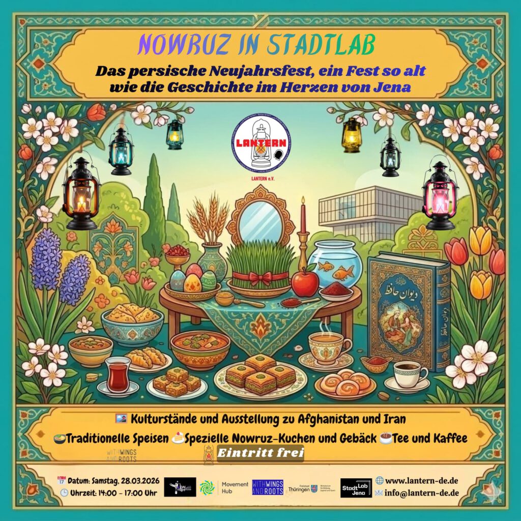 Wir, Lantern e.V., präsentiert voller Stolz eine besondere Nowruz-Ausstellung im Stadtzentrum von Jena, um die Schönheit dieses weltweiten Brauchtums mit euch zu teilen. Unser Ziel an diesem Tag ist es, über ein Fest hinaus eine Gelegenheit für Austausch, gegenseitiges Kennenlernen und die Verbindung innerhalb der Gesellschaft zu schaffen.